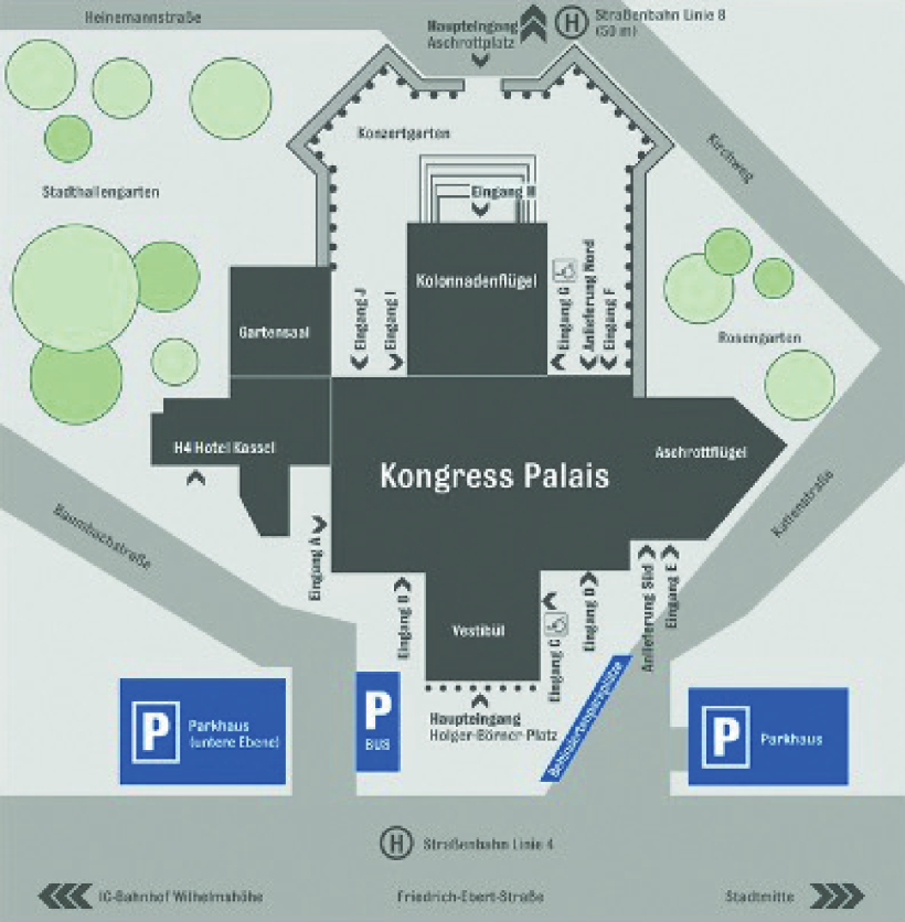 Das Kassel Kongress Palais liegt mitten in Deutschland und ist aus allen Richtungen Europas auf kürzestem Weg zu erreichen. Parkmöglichkeiten finden Sie im Parkhaus Kongress Palais / Kattenstraße mit 109 Stellplätzen und im Parkhaus Hotel mit 35 Stellplätzen.