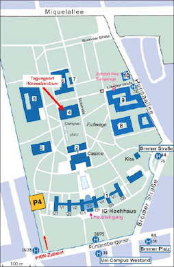 Bitte nutzen Sie die Tiefgarage des Campus Westend (Anschrift s. u.). Die Parkkosten betragen € 5,– und können nur bar bezahlt werden.