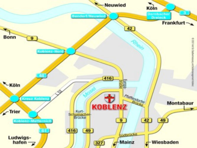 von Süden (Mainz, Ludwigshafen A 61 bis Ausfahrt Waldesch / Koblenz dann weiter auf B 327 von Osten oder aus Richtung Frankfurt A 3 - Dernbacher Dreieck auf die A 48 Ausfahrt Koblenz Nord (B 9)