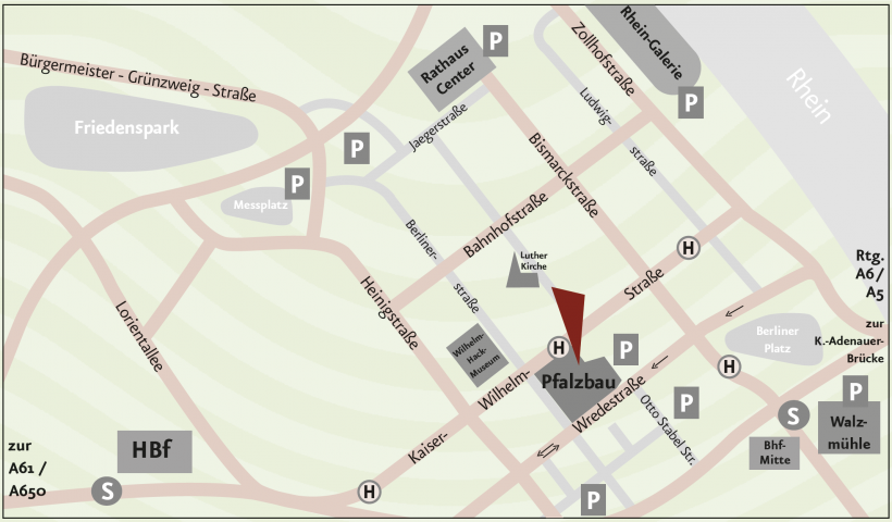 Auf der Konrad-Adenauer-Brücke (B37) den Rhein überqueren. Nach dem Rhein gleich die erste Ausfahrt in Richtung „Pfalzbau“ abfahren und der Hinweisbeschilderung folgen.